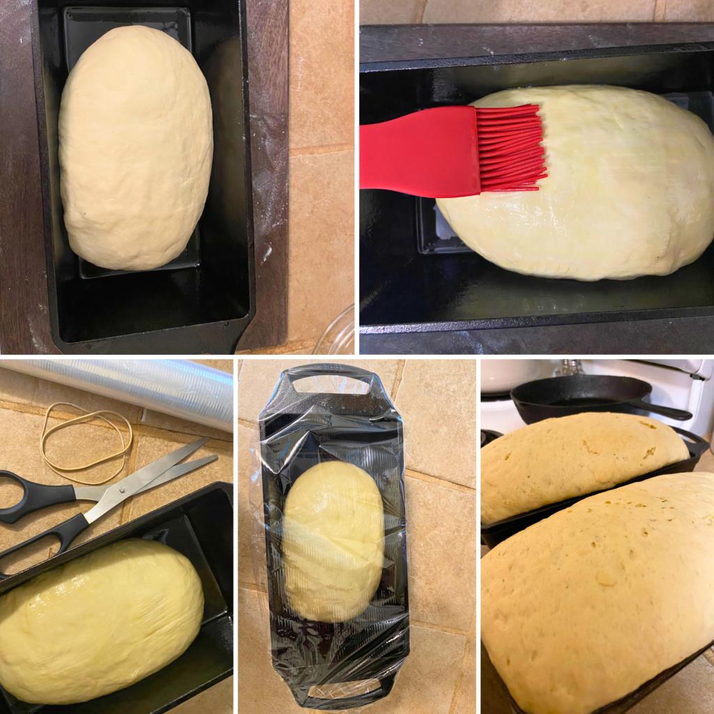 Grease your loaf pan with a bit of olive oil. Place the dough inside seam-side down. Brush the top with a little oil to keep it from sticking to the cover.